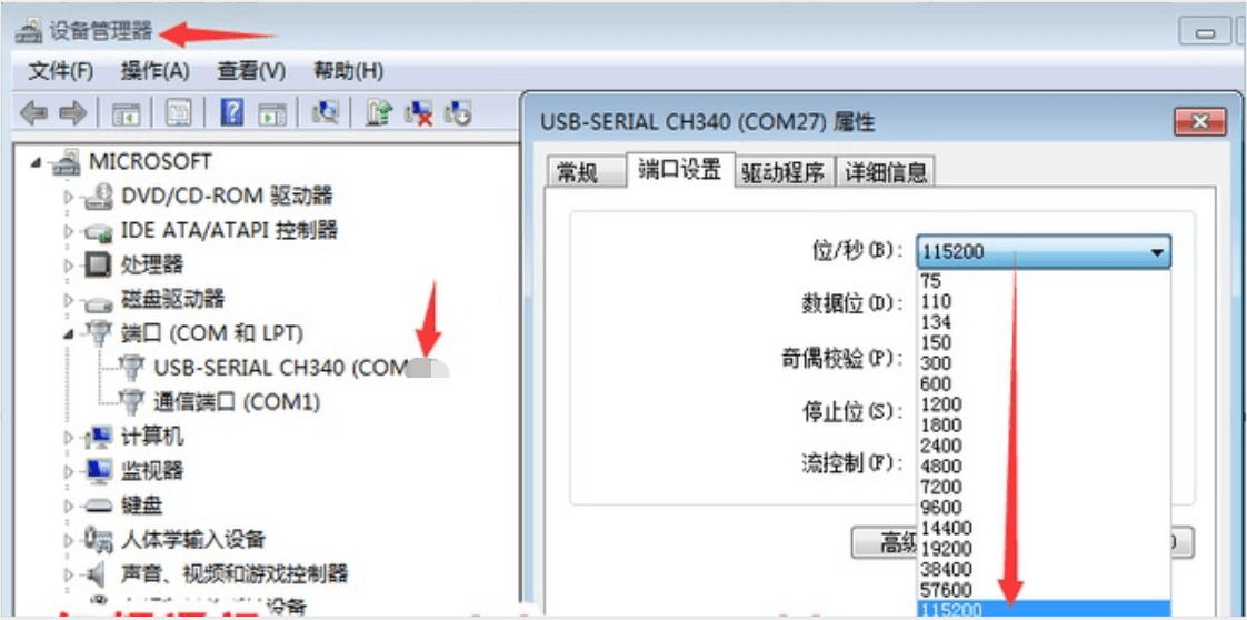 之后把TTL的usb插入一个windows7的电脑,我们去电脑—管理—设备管理器看一下,默认一会就装好了,我们要修改如下的图,USB这个CH340右键属性—端口设置我们修改为115200,COM口一定要记住数字(这个很重要)