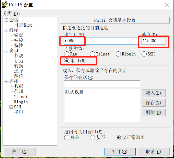 之后我们连接这个盒子,用PuTTY这个软件(注意COM口就是你电脑默认的数字)