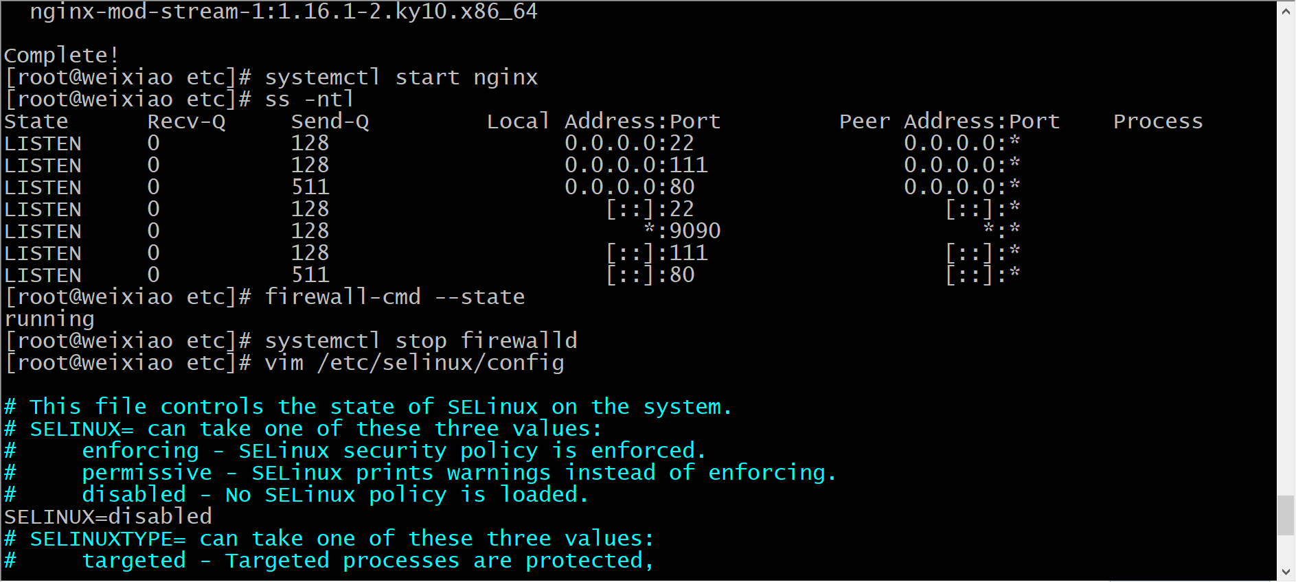 之后关闭防火墙后,在关闭SElinux,nginx就启动了,总结跟Centos使用差异不大。